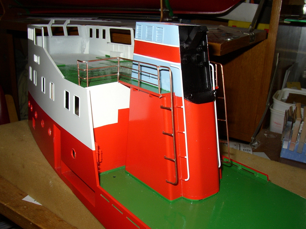 Trup je plaňkován smrkem 2 až 3 mm x 2 až 15 mm. Lepeno Kanagomem k žebrům z překližky ti. 4 až 5 mm. Samozřejmě stavba probíhala kýlem vzhůru. Příď i záď je vybroušena z lipového bloku přilepeného a přišroubovaného na první a poslední žebro. Po hrubém vybroušení plaňkování následovalo napuštění ředěným epoxidem, vně i uvnitř trupu. Pak laminování skelnou tkaninou a starou zatracovanou CHS 1200. Opět broušení, základní nátěr a tmelení klasickým tmelem na karoserie, neekologickým „C“ (nástřik tehdejšími autospreji). Bort je laminován na pozitivním kopytu a vlepen do předem připraveného usazení v trupu a palubě. Ta je plaňkovaná, tmelená a nakonec polepená jednotlivými kroplovanými pláty (také laminát, ale z negativní formy). Nástavba je slepena z laminátových desek tloušťky 1 mm. Tvar je definován dvěma žebry, vodorovnými s vodoryskou. (Paluba má podélný i příčný prošlup.) „Ochlupení“ celé hrubé stavby je již tradičně záležitost měděného drátu, mosazného plechu, papíru, hnědé lepicí pásky, tyčinek od lízátek a kdoví čeho ještě. Stříkáno a natíráno akrylem nebo humbrolkami.