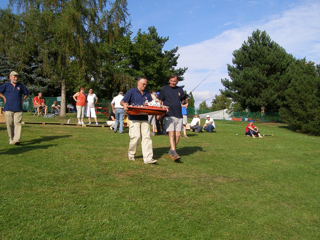 V Polsku jsem odpočíval při akci „Loučení s létem“ v Dobrodzieniu. Tam při pózování fotografům jsem musel dost velký kus s lodí couvat a uvolnila se mi plechová objímka přidržující motor, a šroub vytáhl celou sestavu motor + převodovka + hřídel + šroub z pouzdra hřídele ven. Zastavilo se to až o kormidlo za Kortovou dýzou. Pro mě to znamenalo celou sestavu rozebrat, udělat novou motorovou přepážku a zase vše vložit do trupu. Současně jsem vyměnil převod v převodovce na motoru, ten je nyní 1:3,1 a rychlost je o poznání větší. Účinnější řešení by bylo větší stoupání lopatek, ale do výroby nového šroubu se mi zatím opravdu nechce. Také jsem přehodil rádio a starou 40 jsem nahradil 2,4GHz aparaturou. Tak jsem mohl odstranit i prutovou anténu přijímače, která ne zrovna moc esteticky trčela na zádi z paluby.