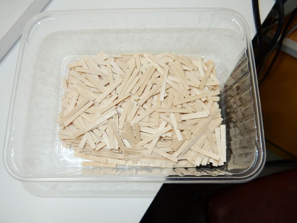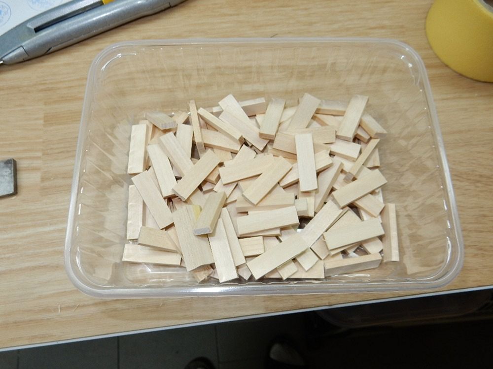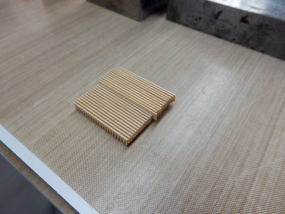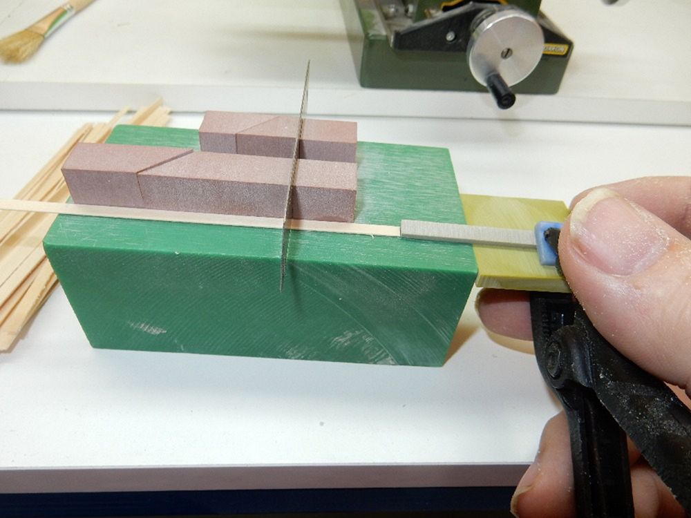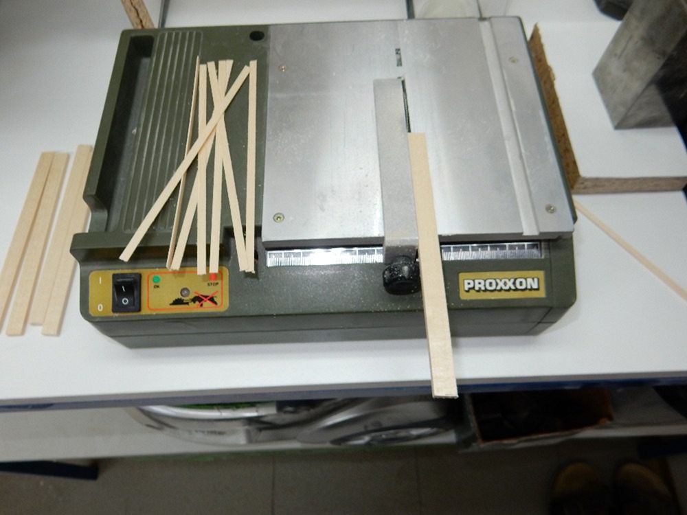 Pochopitelně že originál je buk, nebo teak. Ovšem potom nestačíte brousit pilový kotouč. Toto ovšem souvisí s množstvím gratingových rámů, které vyrábíte. Já potřebuji cca 40 ks o rozměru 20 x 20 mm. Čili jsem musel volit něco normálního. Volba padla na lípu. Žádná výrazná kresba let, minimum suků a nulová smolnatost. Zakoupil jsem nosníky 4 x 10 mm, které jsem ve svazku po třech nařezal na pokosové pile s dorazem. Celkem 120 ks.