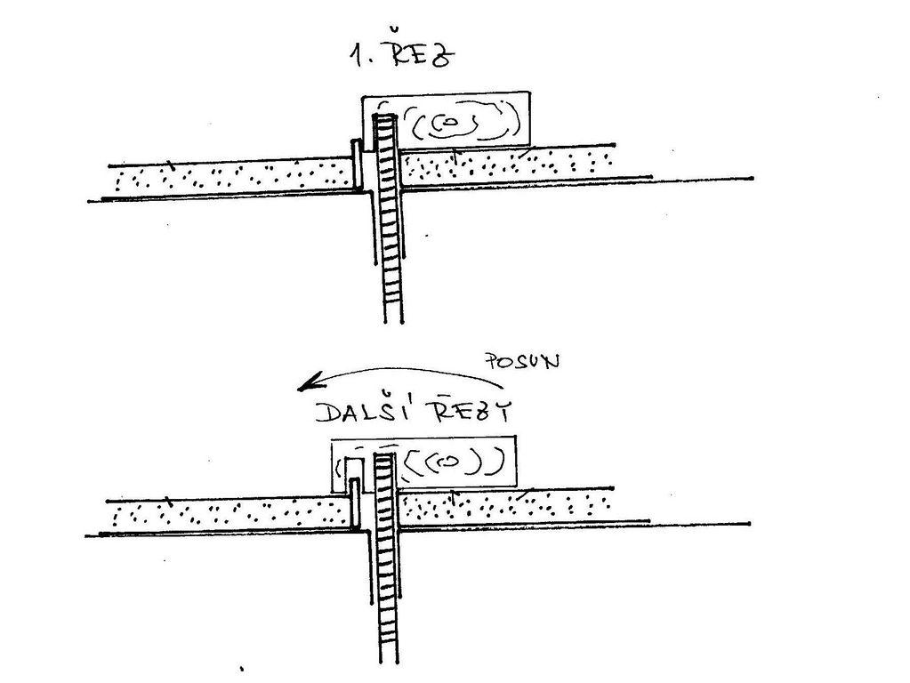 Pro někoho, kdo tuto metodu opravdu nezná, je na dalším obrázku vidět, jak se v materiálu provede 1. řez a pak posunutím na dorazu (vodící liště) řezy další.