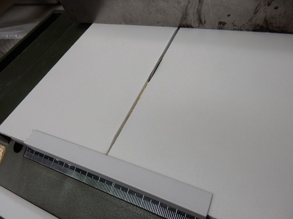 Další etapou je nařezání nosníčků – voštin, které se budou vlepovat z jedné strany do přeřezaných dílů. Nastavení dorazu na pile a tím zvolení tloušťky voštiny je zásadní! Příliš silné díly způsobí při mačkání do drážek prohnutí základního dílů. Příliš tenké se v drážkách viklají, vzniklé mezery nevypadají dobře a ani lepení není ideální.