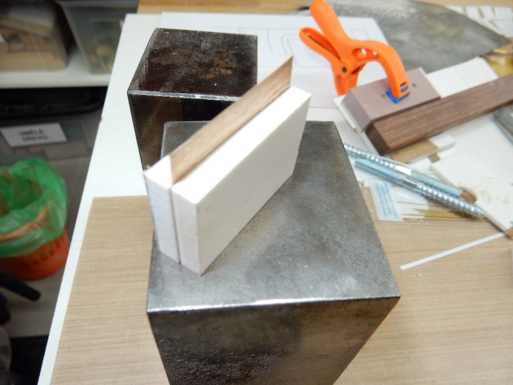 Po zalepení se nebojím pořádně zatěžkat, ať voštiny dosednou na dna drážek. Na závaží viditelné moje udělátko na nanášení lepidla.