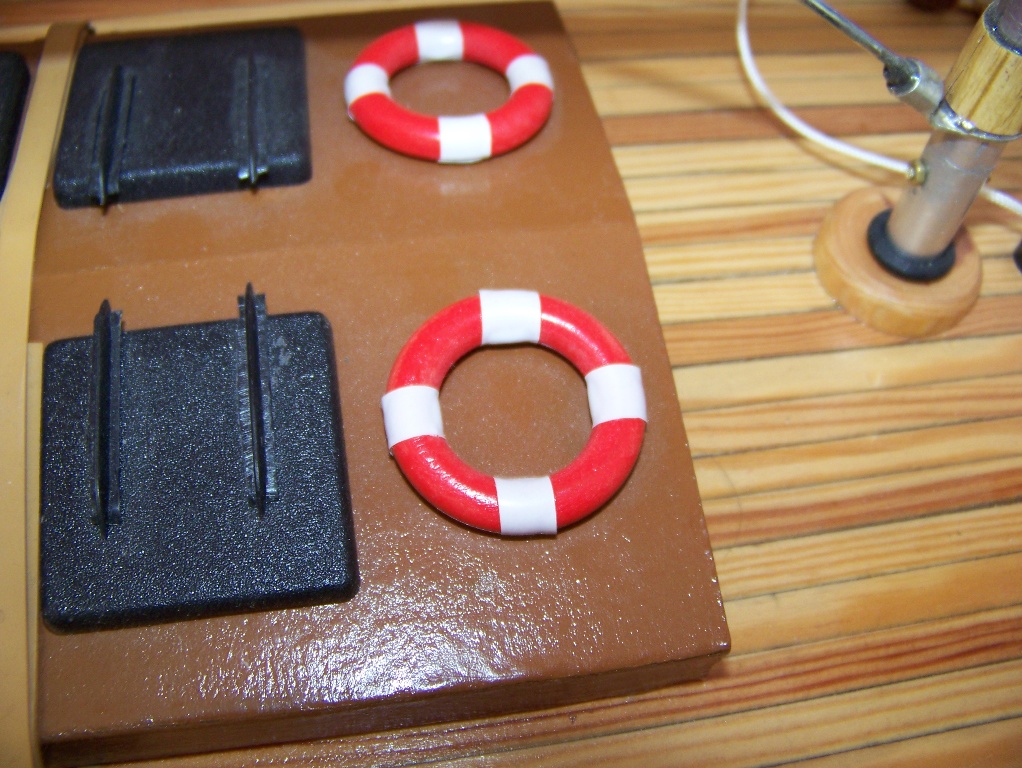 Nejprve je nastříkám obvyklou signální červenou barvou. V oddělení elektra stačí koupit elektrikářskou izolační pásku (izolačku), v bílé barvě. Jiné barvy se lodnímu modeláři hodí též, jen pro tento účel si bohatě vystačím s bílou, kterou nastříhám na úměrně široké pásky. Nachystané pásky nalepím v roztečích 90° kolem kroužku, čímž získám pěkný a věrný záchranný kruh natotata. Má přesné rozhraní obou barev a reliéfně vystupující pásky přes kruh, což rovněž odpovídá skutečnosti.